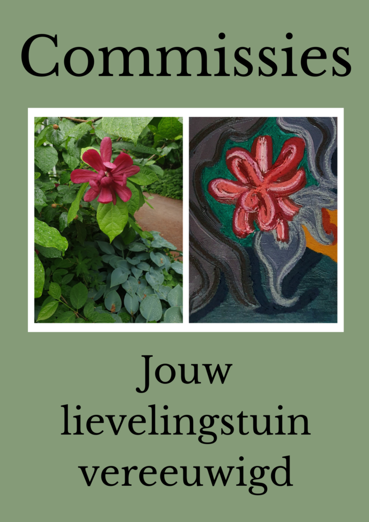 Wat: ik bied commissies aan (werk in opdracht) waarbij ik een specifieke tuin voor je vastleg in series inkttekeningen of olieverfschilderijen die ik naar wens kan ontwikkelen tot unieke producten als decoratieve patroonblokken, stijlvolle sjaals of botanische kussens.
