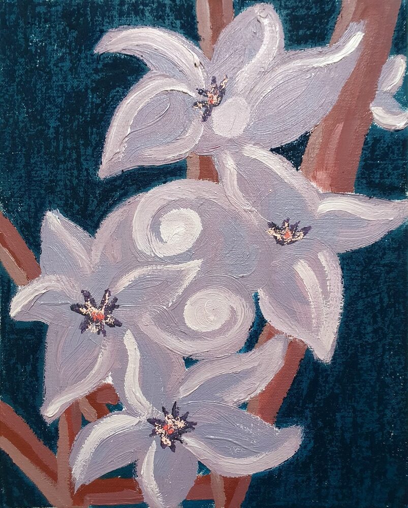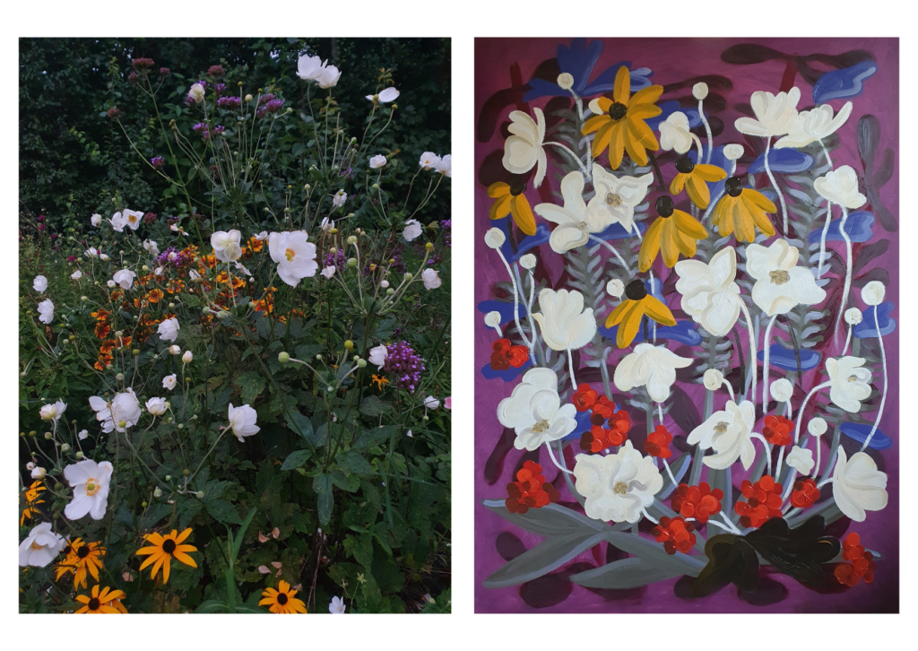 Tegen het einde van de zomer liep ik tijdens de schemering door mijn moeders tuin en viel het me op hoe het avondlicht de kleuren dempte. Felpaars werd aubergine, magenta werd oudroze. Deze kleuren kon mijn hart wel aan, met een aantal schilderijen als resultaat.