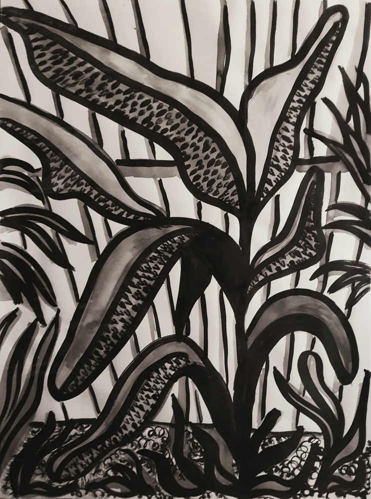 Vier weken in een totaal andere wereld. Een andere klimaatzone vol andere botanische vormen: inspiratie waarop ik ruim een jaar heb kunnen teren. Maar ook: zo heet dat ik niet kon nadenken als ik niet in de airco van de supermarkt of de auto was waardoor de maand in mijn herinnering is verworden tot een soort koortsdroom. Tekenen in trance en schilderen als seance.