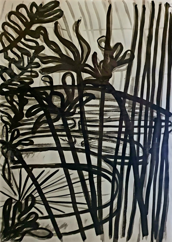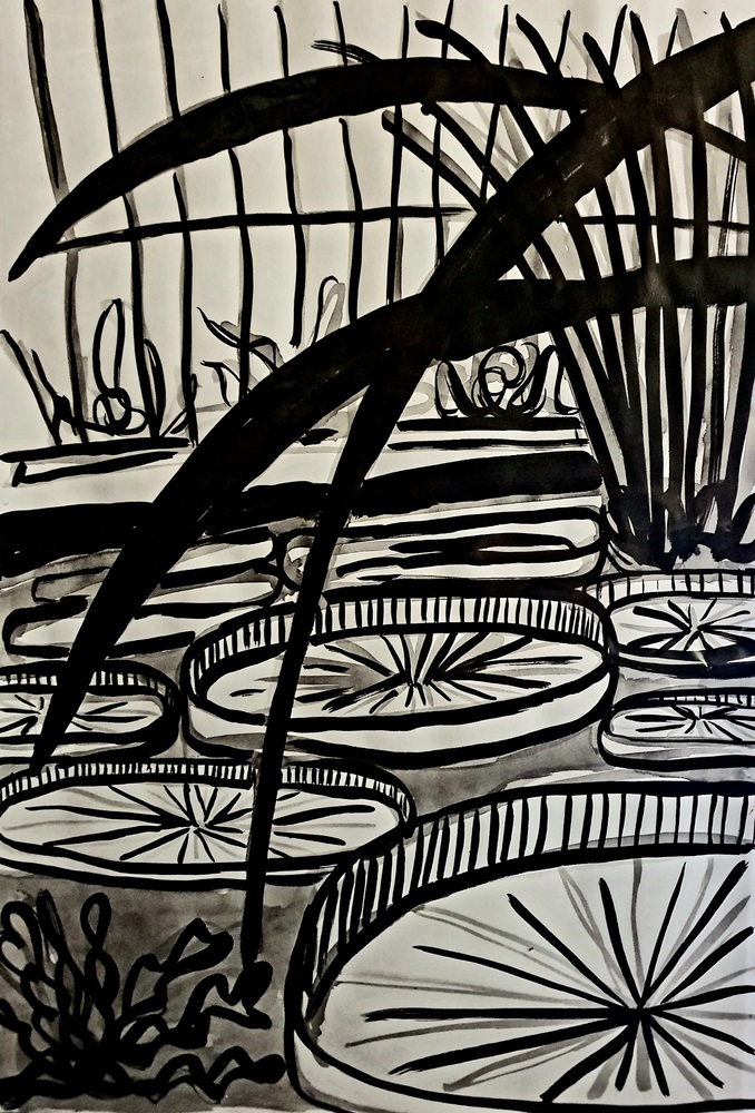 De tekeningen en schilderijen van mijn “In de Kas” of “Inside the Glasshouse” serie zijn geïnspireerd op de schaduwplanten in de kassen van de Botanische Tuin van Glasgow en de Jochemhof in Steyl, die ik beide bezocht in de herfst van 2023.