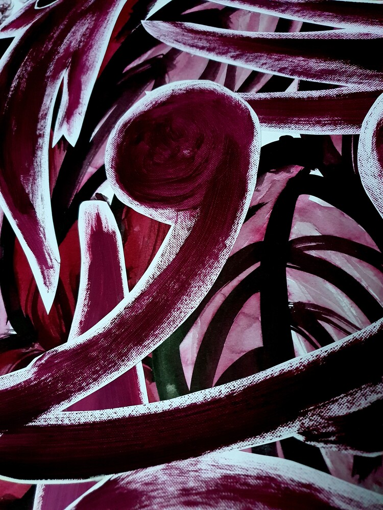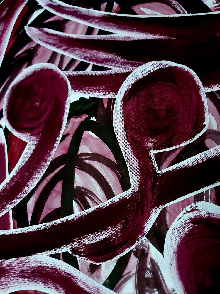 Tijdens het tekenen en schilderen van muskaatsalie viel het me op hoezeer de vormen op een muziekstuk begonnen te lijken. Alsof een compleet ritmisch notenschrift voor mijn ogen ontstond. En toen ik beter keek vormden ook de andere collages combinaties van muzikale thema’s. Notenbalken, muzieksleutels, toonladders en akkoorden, alles was aanwezig voor een harmonieus geheel. Een serie muziekstukken in artistiek purper. Toepasselijker kon niet, want net als muziek staat de kleur paars voor het niet-tastbare innerlijke.