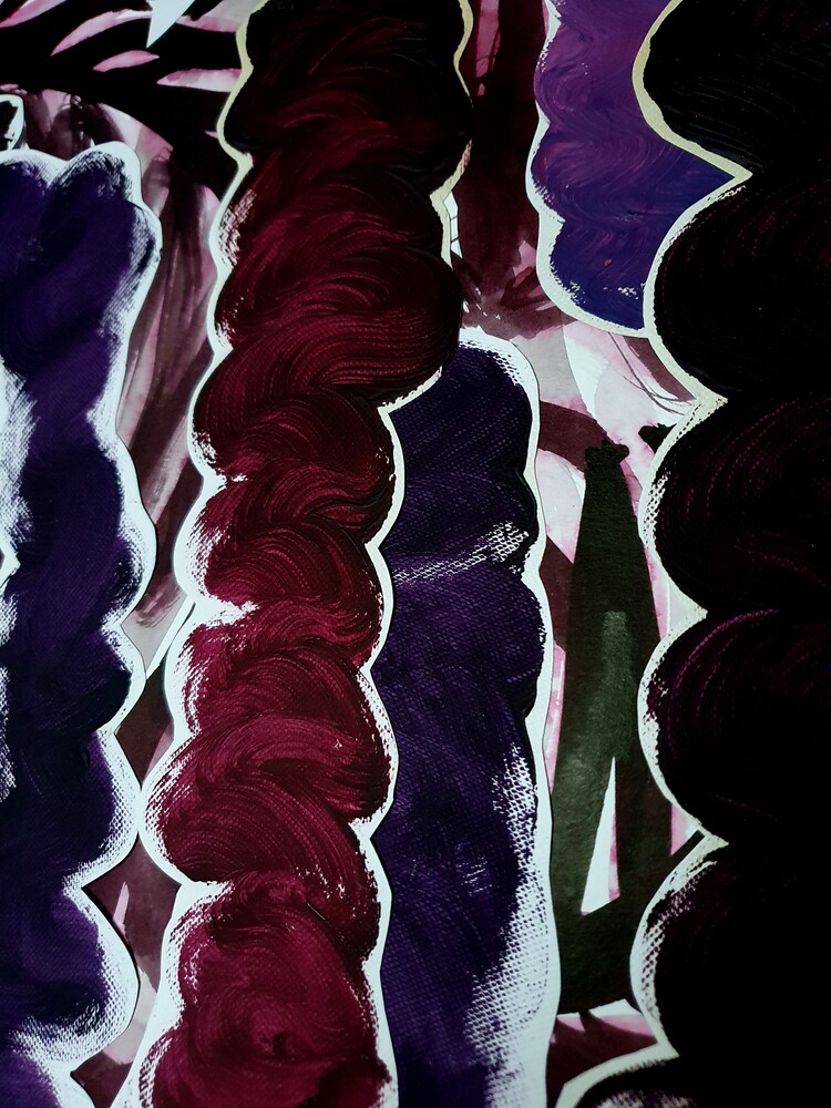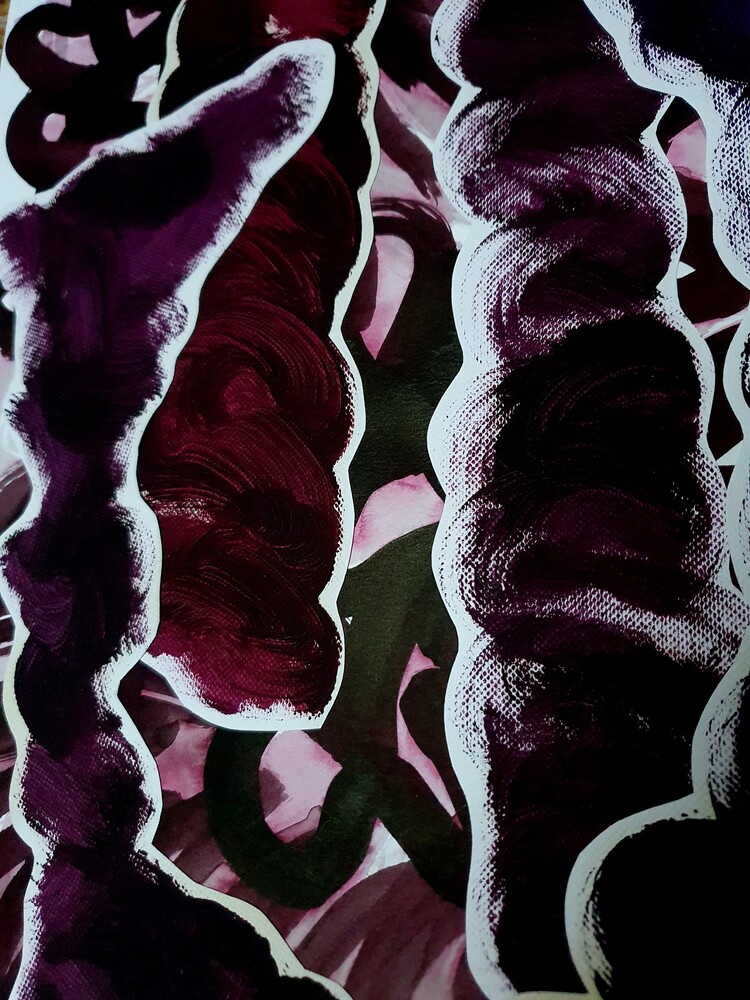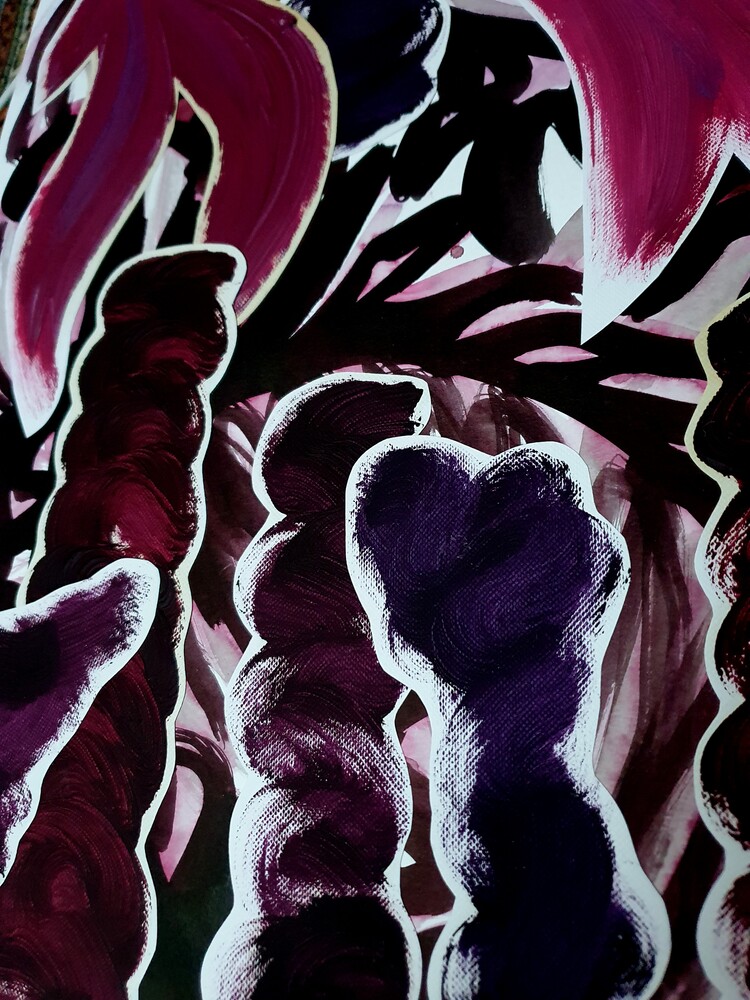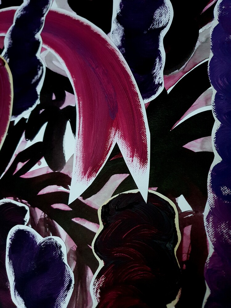 Tijdens het tekenen en schilderen van muskaatsalie viel het me op hoezeer de vormen op een muziekstuk begonnen te lijken. Alsof een compleet ritmisch notenschrift voor mijn ogen ontstond. En toen ik beter keek vormden ook de andere collages combinaties van muzikale thema’s. Notenbalken, muzieksleutels, toonladders en akkoorden, alles was aanwezig voor een harmonieus geheel. Een serie muziekstukken in artistiek purper. Toepasselijker kon niet, want net als muziek staat de kleur paars voor het niet-tastbare innerlijke. De Muskaatsalie op Muziek is het eerste akkoord in een sonnet van collages, geinspireerd op de zomer van 2024 waarin ik na de dood van mijn moeder intuitief mijn psyche opnieuw inrichtte. Het verlies een plek gaf en mijzelf voorbereide op een toekomst waar naiviteit en onschuld plaatsmaakten voor initiatie en levenservaring.