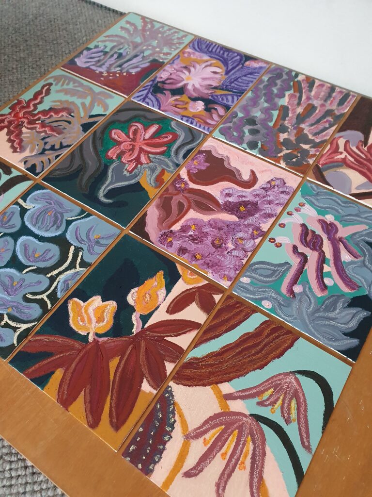 Blijkbaar willen deze canvasboards beschilderd worden in de zomer of tijdens een hittegolf? Want ze hebben me bijna een heel jaar aangestaard vanaf hun hoek in het atelier. Basislaag voltooid en droog, klaar voor de volgende stap. Maar er gebeurde niets in mij.