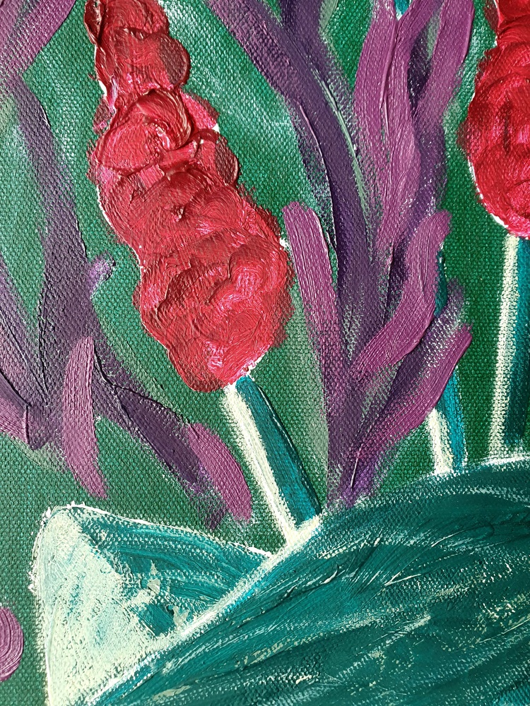 Towards the end of summer, I walked through her garden at dusk and noticed how the evening light muted the colors. Bright purple became aubergine, magenta became dusky pink, and all shades of green took on a blue cast. I could handle these colors, resulting in several oil paintings.