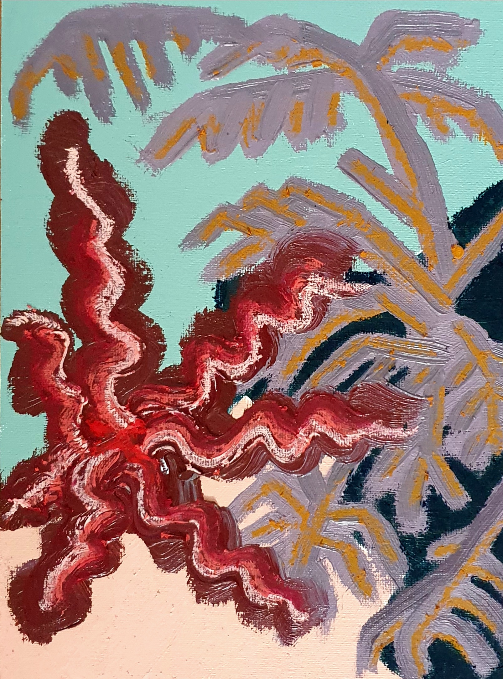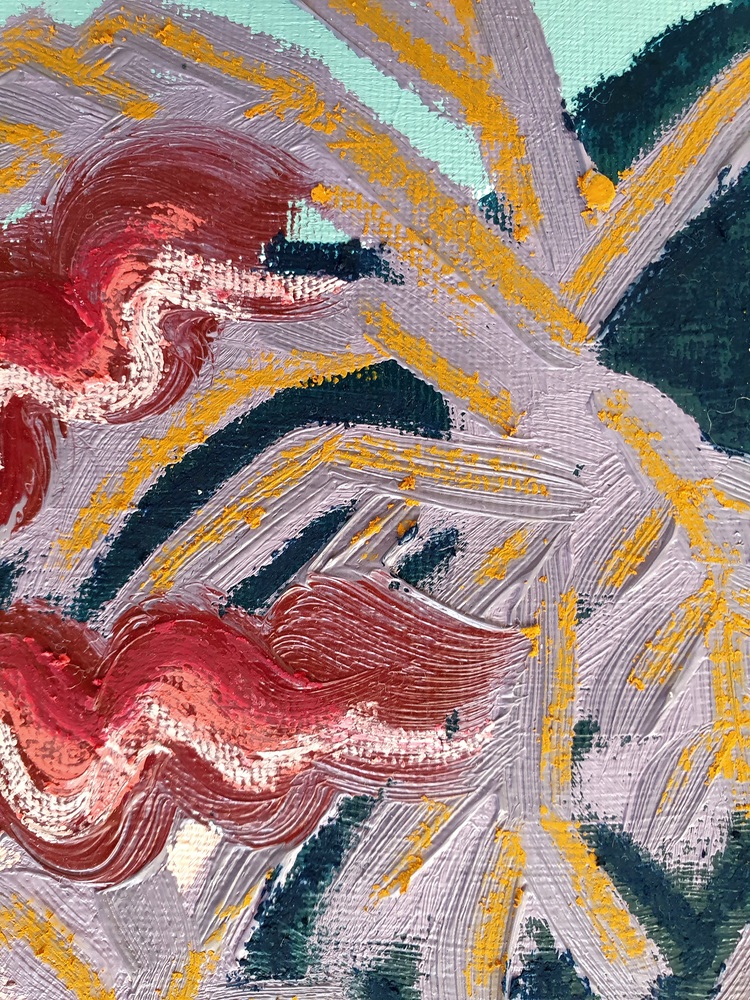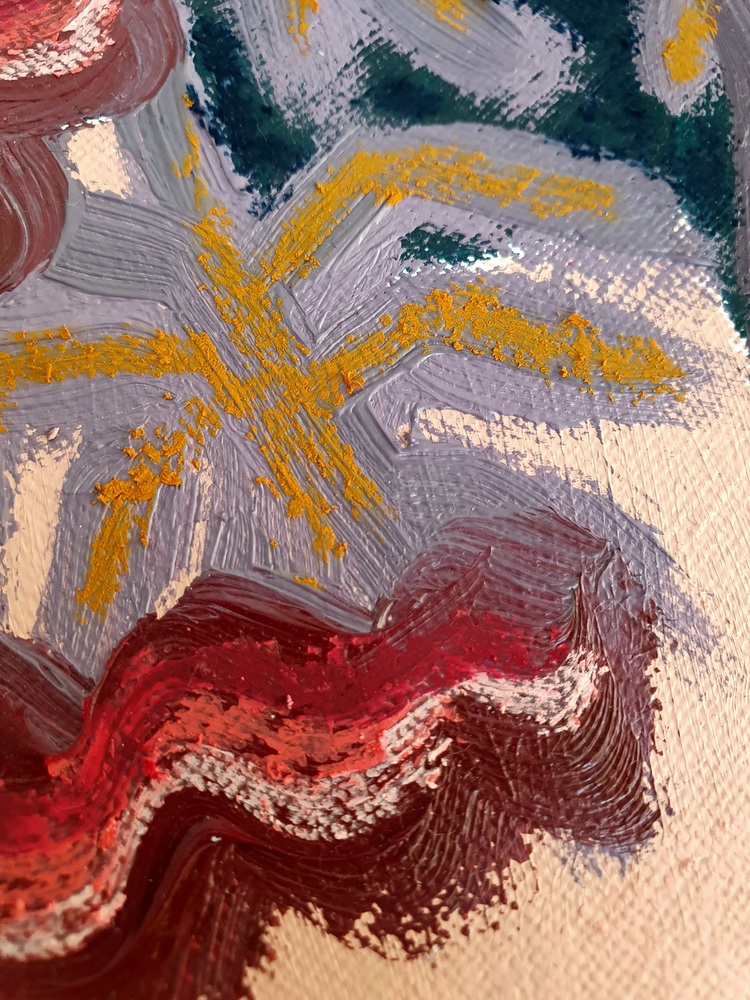 Oil paint and oil pastel on canvas board, 18 x 24 cm, upon request in plain wooden frame.
