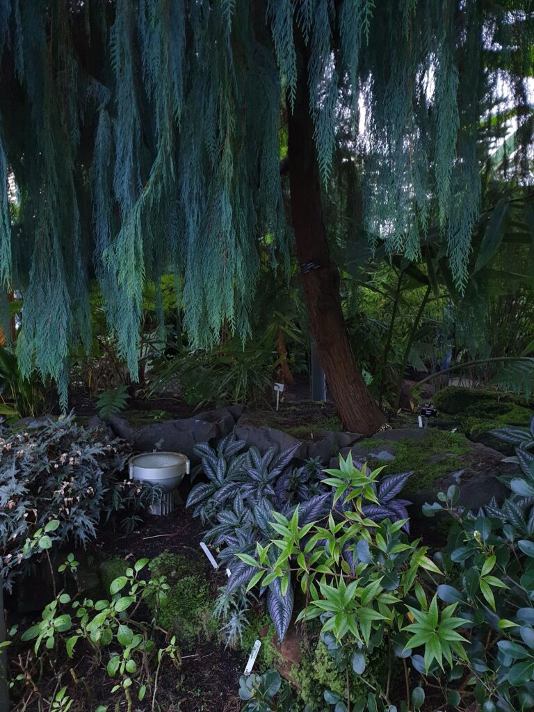 Protected from all harsh weather conditions by a large Glauca Pendula grows a cosy collection of small shade-loving plants. It’s safe for them to show all their colours guarded by the large blue tree.