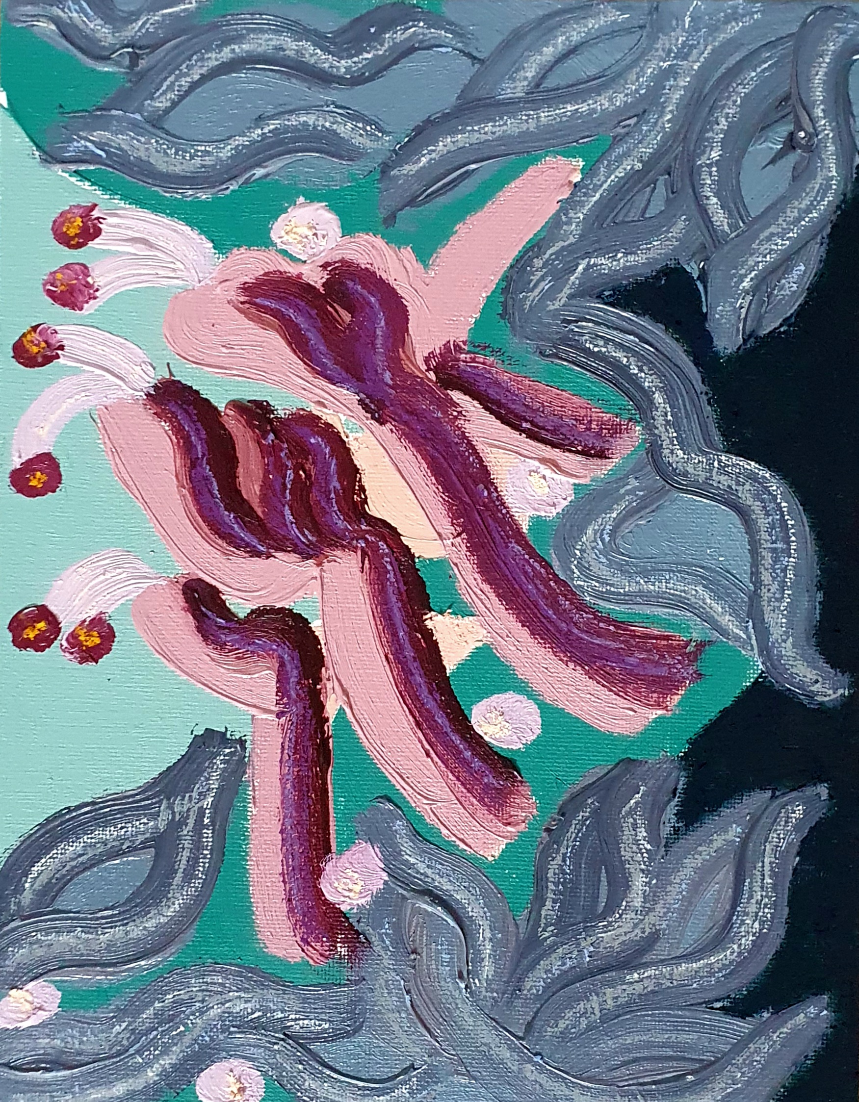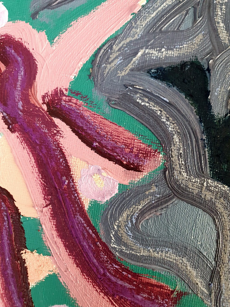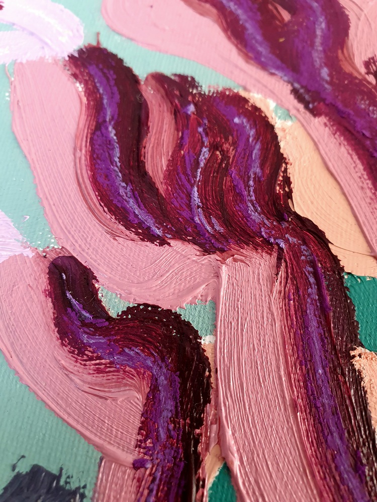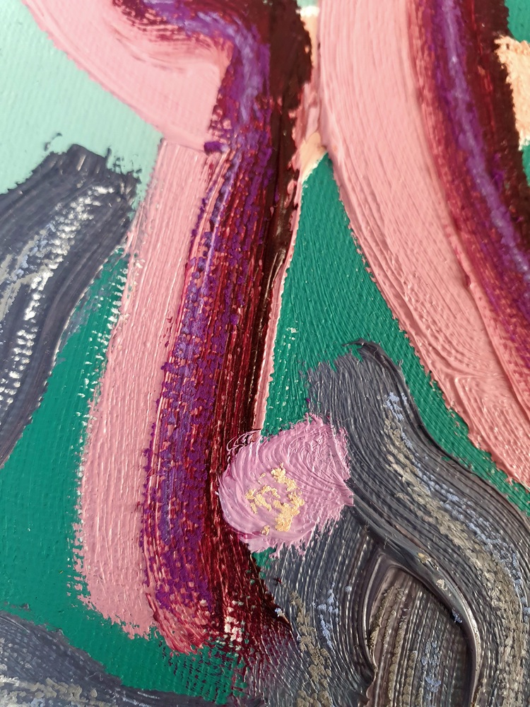 Oil paint and oil pastel on canvas board, 18 x 24 cm, upon request in plain wooden frame.