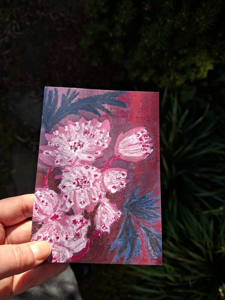 Op de voorkant van deze dubbele wenskaart met blanco binnenkant herken je misschien mijn Astrantia major schilderij.